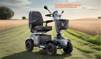 Das Riga EVO verbindet 15 km/h Spitze, kompakten Wendekreis und die langlebige LiFePO4-Akkutechnologie. Konfigurierbar mit einem oder zwei 24 V / 50 Ah LiFePO4-Akkus für bis zu ~80 km Reichweite*.