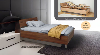 Das Seniorenbett Relax von Burmeier verbindet die Optik eines modernen Holzbett-Rahmens mit optionaler elektrischer Höhenverstellung und ergonomischem Komfort. Auf Wunsch lässt es sich mit dem Betteinsatz Lippe kombinieren – für echte Pflegebett-Funktionen, die im Wohnstil „unsichtbar“ bleiben.